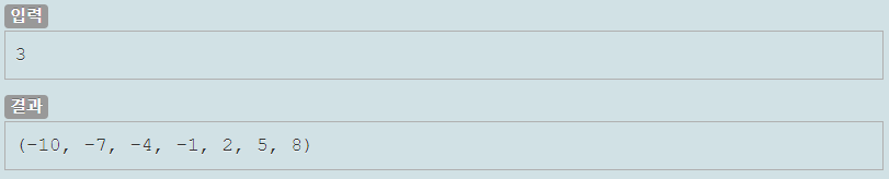 표준 입력으로 정수가 입력됩니다. range의 시작하는 숫자는 -10, 끝나는 숫자는 10이며 입력된 정수만큼 증가하는 숫자가 들어가도록 튜플을 만들고, 해당 튜플을 출력하는 프로그램을 만드세요(input에서 안내 문자열은 출력하지 않아야 합니다).