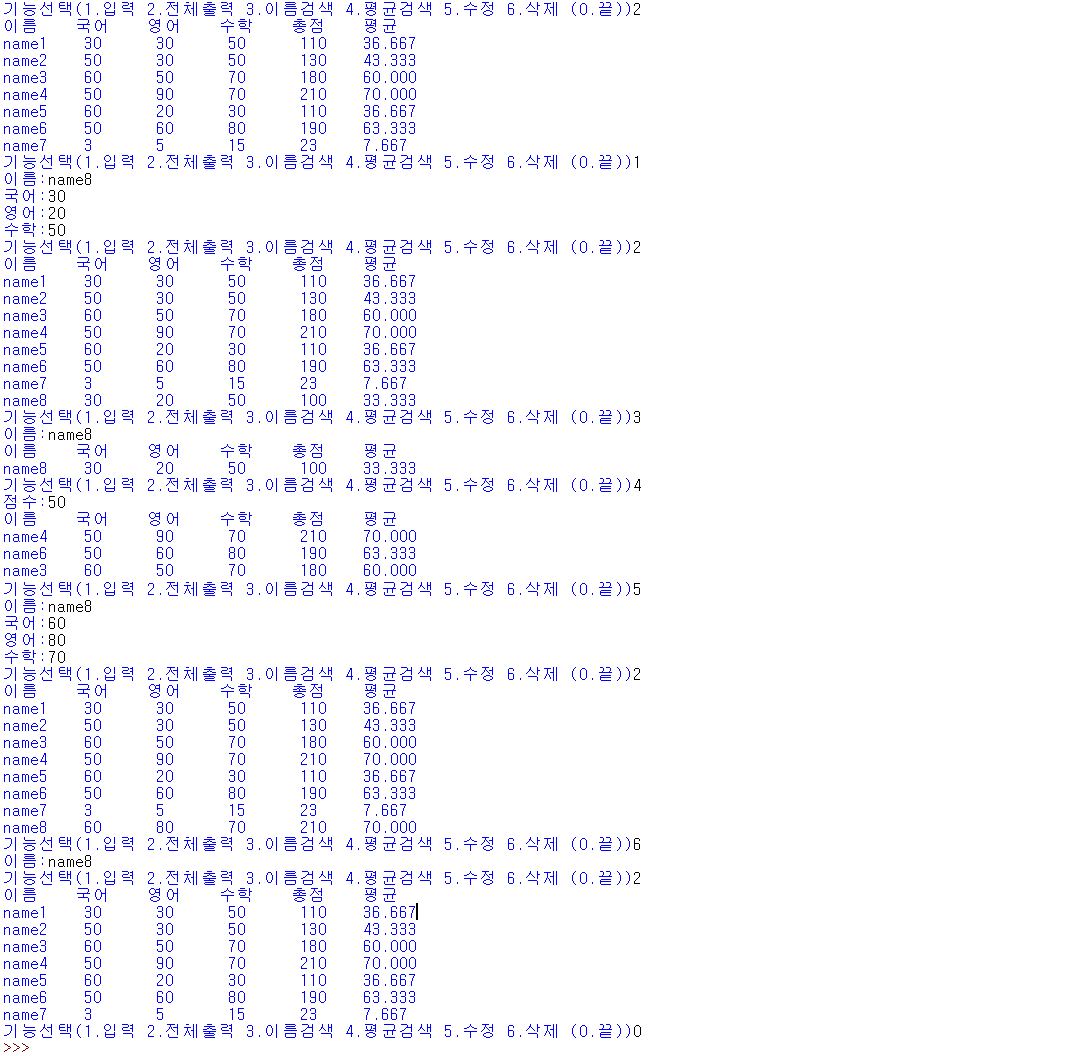 num = int(input("기능선택(1.입력 2.전체출력 3.이름검색 4.평균검색 5.수정 6.삭제 (0.끝))"))