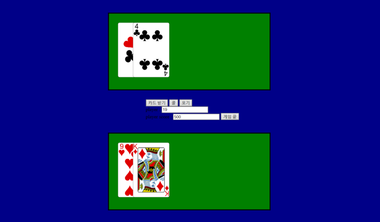 플레이어는 카드 받기 버튼을 클릭하여 1장의 카드를 계속 받을 수 있다. 이 때, 숫자 21을 초과하는 순간 딜러의 승리로 게임이 끝난다.