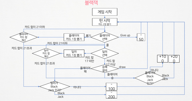 딜러의 경우 숫자 17미만이면 카드를 계속 뽑는 규칙이 적용되어 있다.