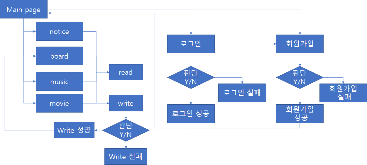 페이지는 메인페이지와 로그인페이지, 회원가입페이지, 마이페이지, 게시판 페이지로 이루어져있다.