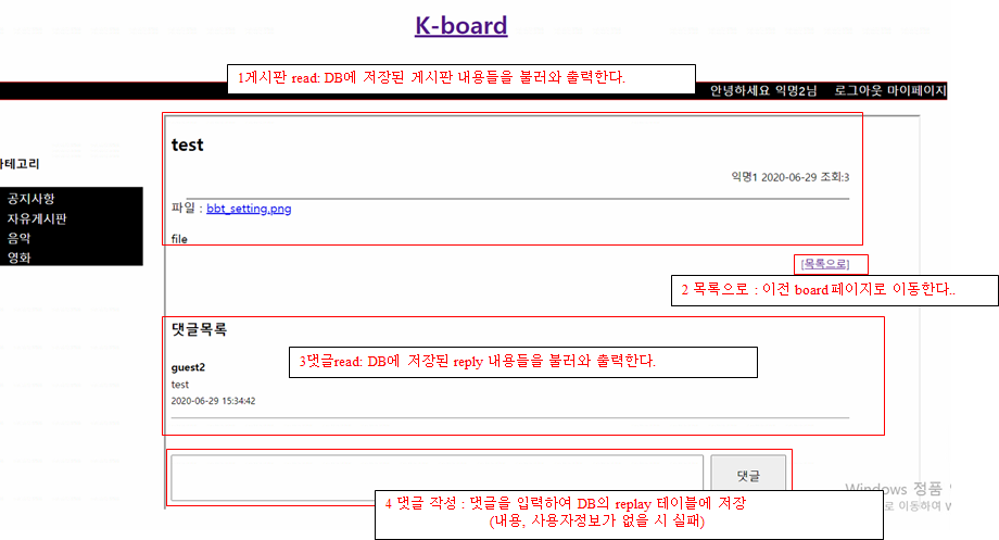 게시판 페이지에서 게시글을 누르면 데이터베이스에서 그 게시글을 읽어와 출력한다.