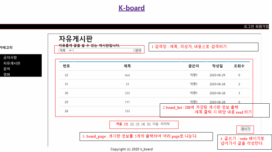 게시글은 한 페이지에 5개씩 출력되고 여러 페이지로 나뉜다.