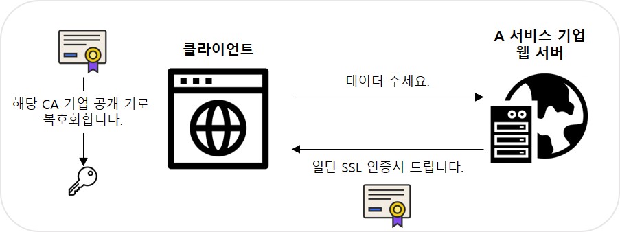 - 목록에 존재하는 CA라면 클라이언트는 이미 알고 있는 해당 CA의 공개 키를 이용해 해당 인증서를 복호화한다.