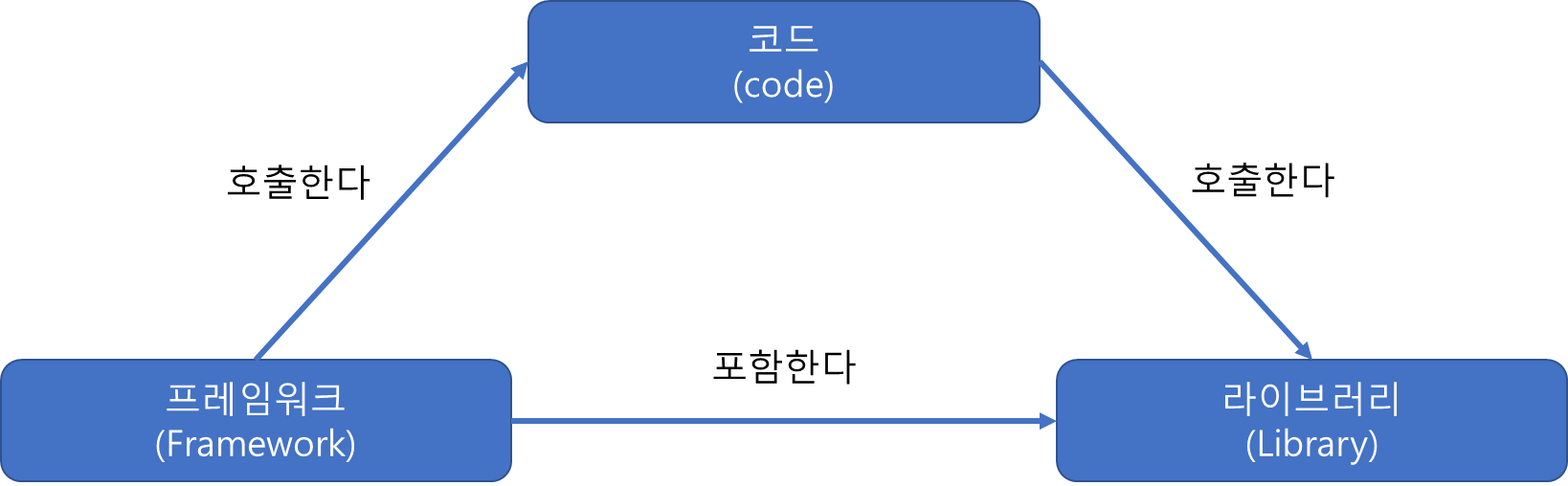프레임워크는 전체적인 흐름을 스스로가 쥐고 있으며 사용자는 그 안에서 필요한 코드를 짜 넣으며 반면에 라이브러리는 사용자가 전체적인 흐름을 만들며 라이브러리를 가져다 쓰는 것이라고 할 수 있습니다.