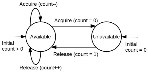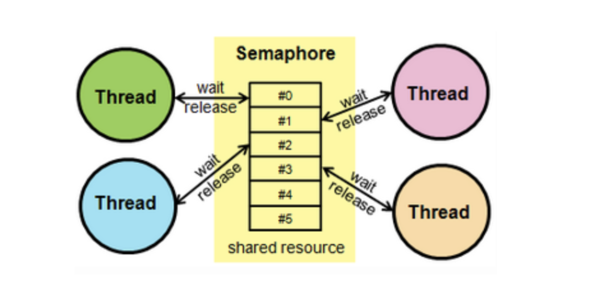 세마포어는 크게 Counting Semaphores, Binary Semaphore 2종류가 있습니다. 카운팅 세마포어는 세마포어의 카운트가 양의 정수값을 가지며, 설정한 값만큼 쓰레드를 허용하고 그 이상의 쓰레드가 자원에 접근하면 락이 실행됩니다. 바이너리 세마포어는 세마포어의 카운트가 1이며 Mutex처럼 사용될 수 있습니다.(뮤텍스는 절대로 세마포어처럼 사용될 수 없다.)